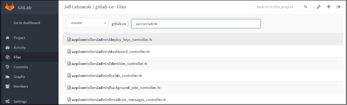 The file finder feature allows you to quickly shortcut your way when you are searching for a file in a repository using the GitLab UI.